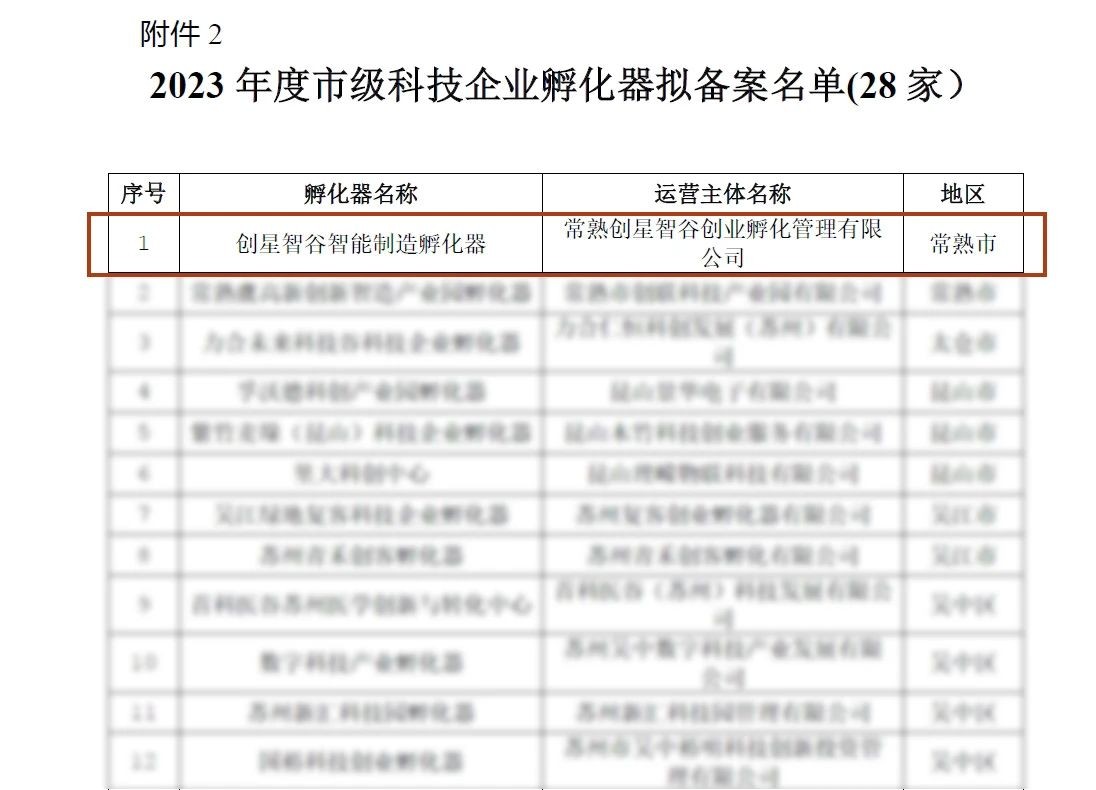 会员单位动态|创星智谷智能制造孵化器入选2023年度市级科技企业孵化器拟备案名单 2023-12-08 14:19:39 今日关于2023年苏州市市级科技创业孵化载体拟备案名单公示其中创星智谷智能制造孵化器(农发创星智谷科创中心)成功入选市级科技企业孵化器拟备案名单